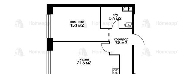 Практичная планировка квартиры удобна для проживания: просторная кухня-гостиная 21,6 м² позволяет установить дополнительное место для отдыха и использовать квартиру как евро 2-комнатную. Изолированная жилая спальня 15,1 м², коридор 7,8 м² и санузел 5,4 м².