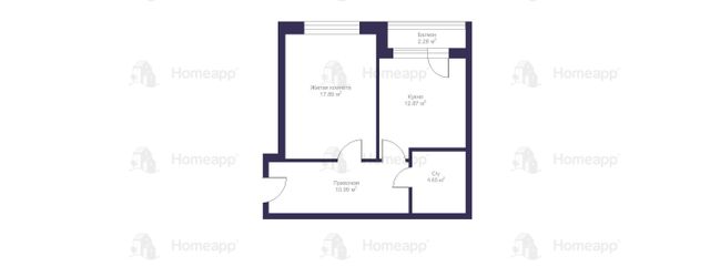 Кухня-гостиная, спальня, с/у, лоджия и просторный коридор (можно сделать отличную нишу под гардероб).