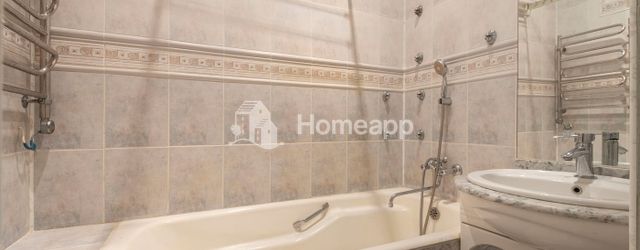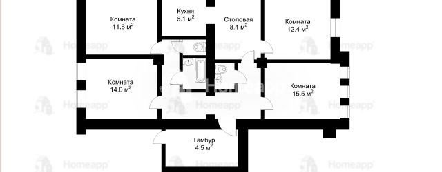 Площадь квартиры 91 м². Кухня – столовая, площадью 14 м² (кухня 6,1 м² и столовая 8,4 м²). Четыре изолированные комнаты 15,5 м², 14 м², 12,4 м², 11,6 м². Просторная прихожая со встроенными шкафами. Два санузла: один раздельный санузел – ванная комната и туалет, и один совмещенный санузел.
