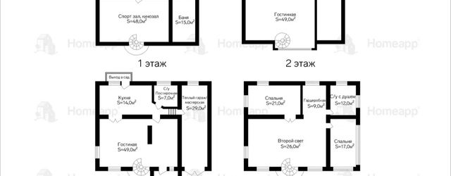Цокольный этаж: фитнес, кинозал, зоны хранения, котельная, подсобная, сауна, душ, комната отдыха.